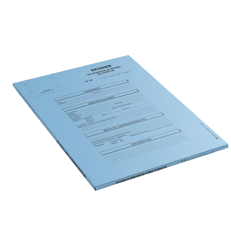 Chemise Permis de démolir, format 24 x 32 cm, carton 250g bleu, avec rabats. Idéale pour classer et archiver les demandes d’urbanisme en mairie.
