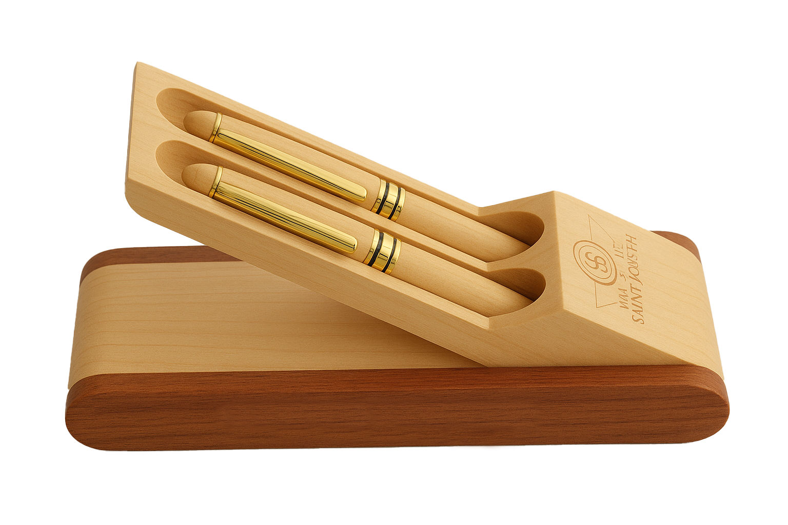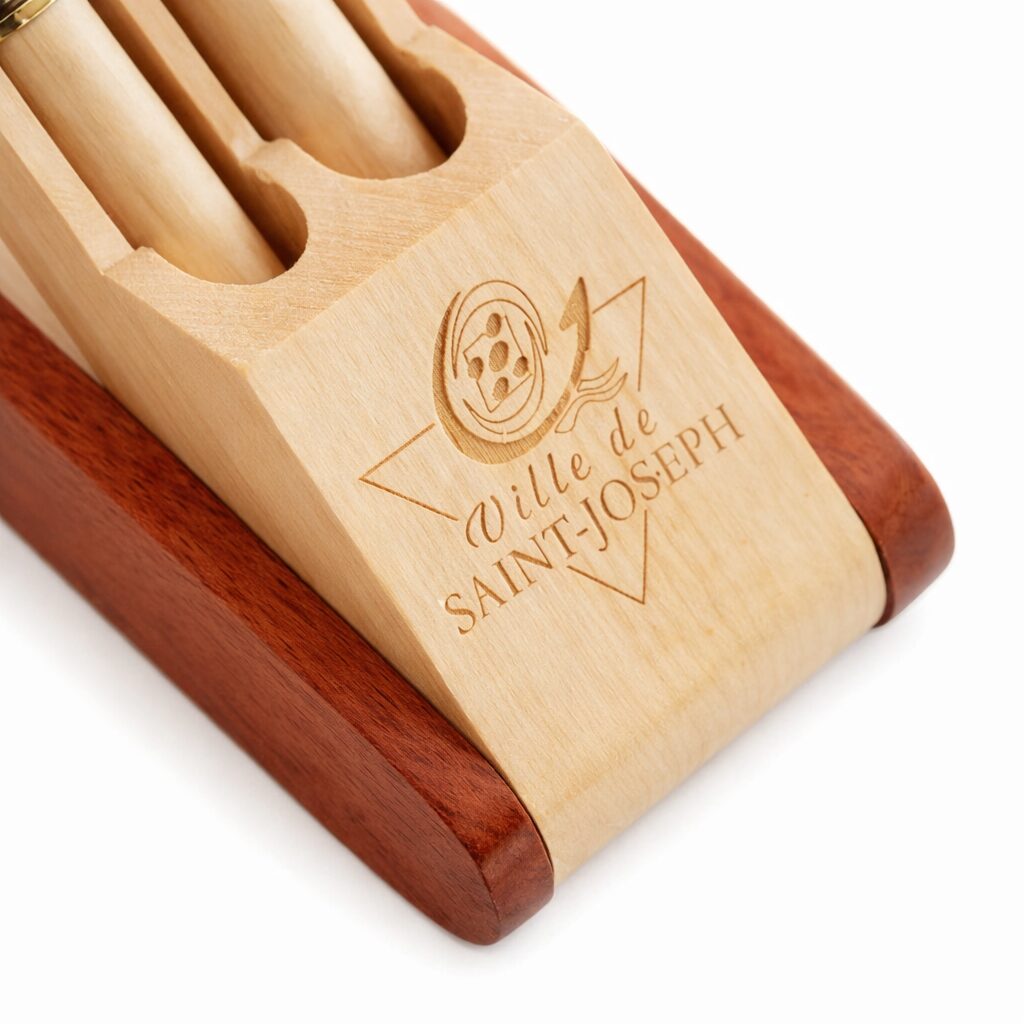 Présenté dans un écrin en bois raffiné, cet ensemble allie esthétique et praticité. En position ouverte, l’écrin se transforme en un élégant présentoir à stylos, idéal lors des cérémonies officielles, remises de distinctions ou événements municipaux.