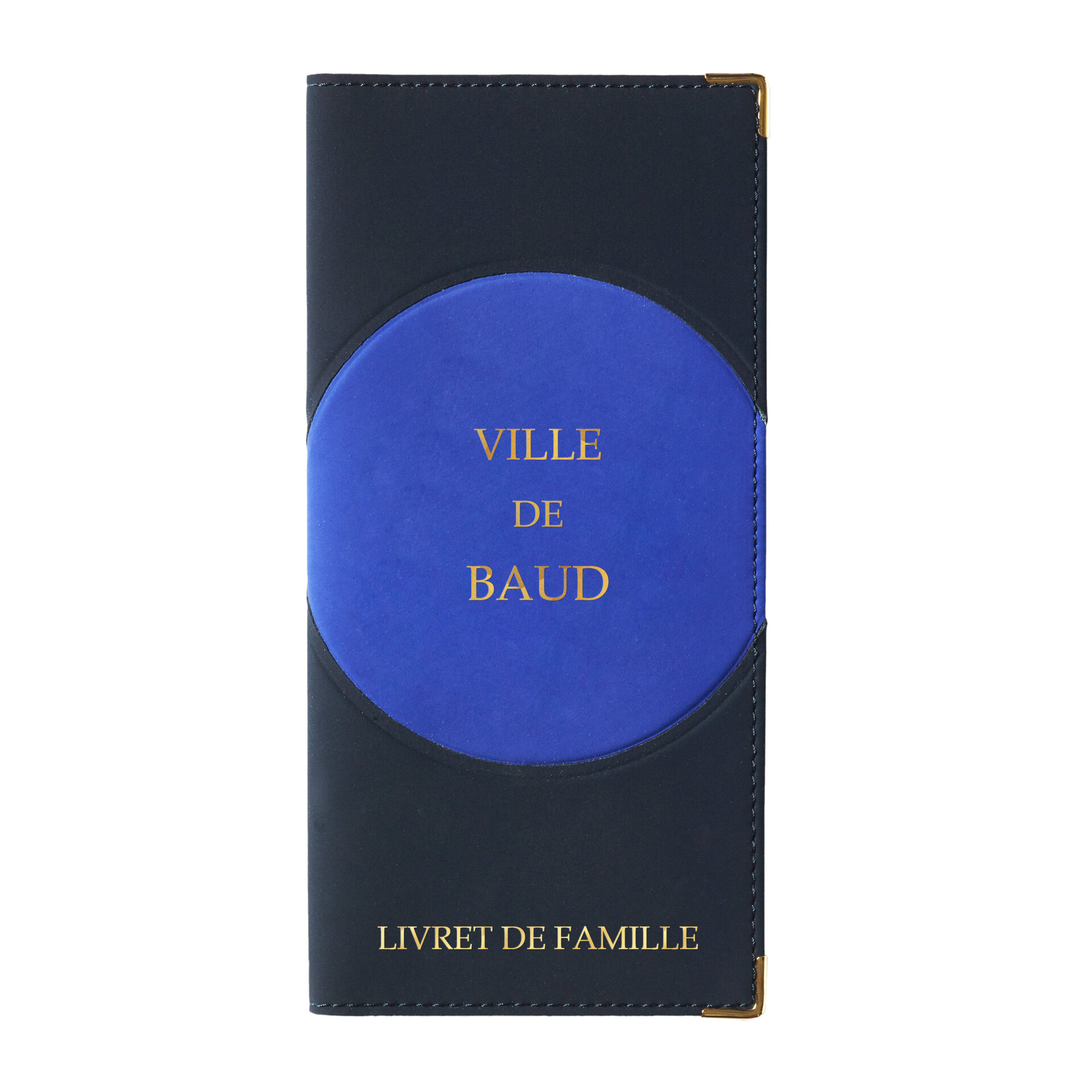 Étui livret de famille en nubuck personnalisable avec dorure, coins dorés et rabats. Idéal pour une remise élégante en mairie.