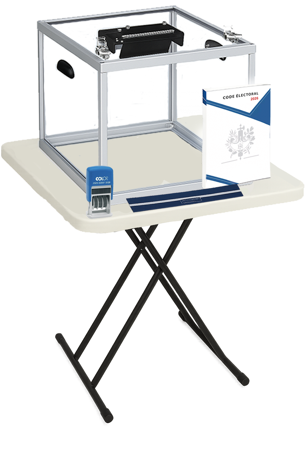 Kit électoral complet pour les élections municipales 2026 : table pliante, urne 800–1200 bulletins, réglette d’émargement, mini tampon dateur et Code électoral simplifié. Prêt à l’emploi, simple à installer et conforme aux normes officielles.