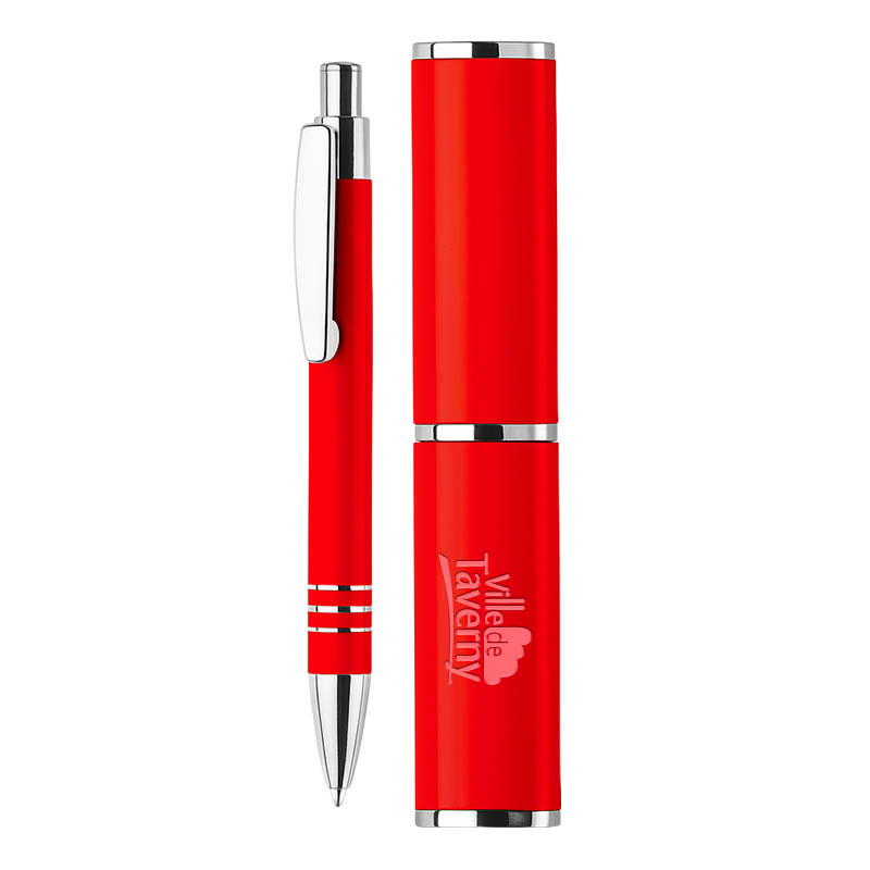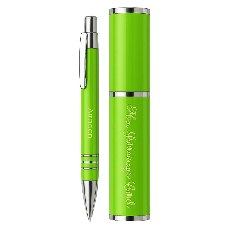 Écrin cylindrique en métal laqué 149 x 23 mm, idéal pour les parrainages civils. Disponible en plusieurs coloris et personnalisable sur l’étui et le stylo.