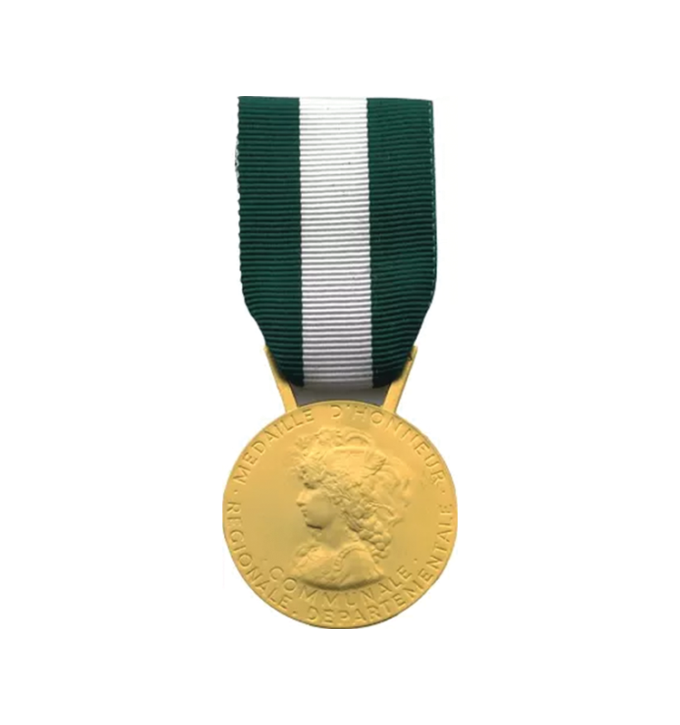 Médaille d’honneur régionale départementale et communale en or pour 30 ans de service dans les collectivités territoriales. Gravure personnalisée disponible.