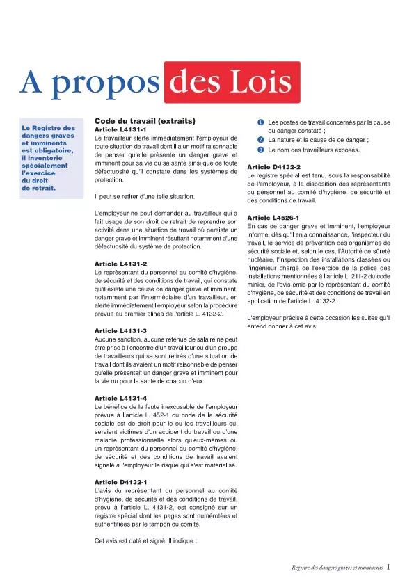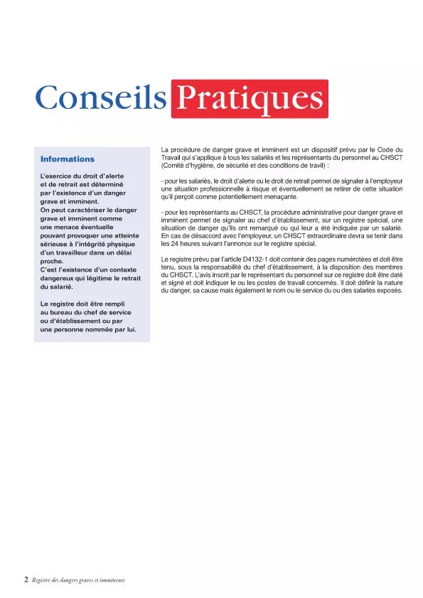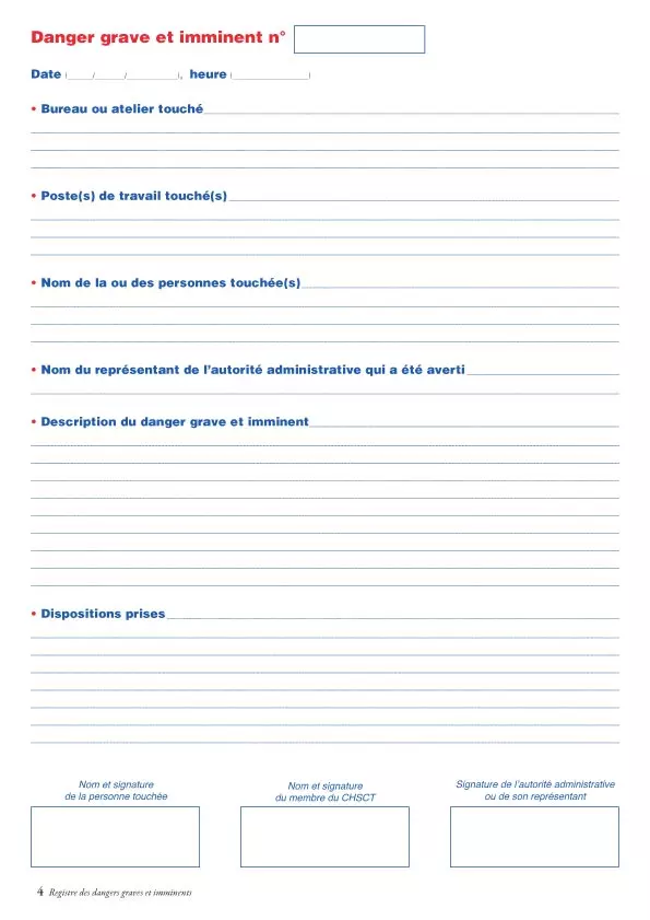 Registre obligatoire pour signaler les dangers graves et imminents et exercer le droit de retrait. 44 pages A4, papier ISO9706, fabrication française.