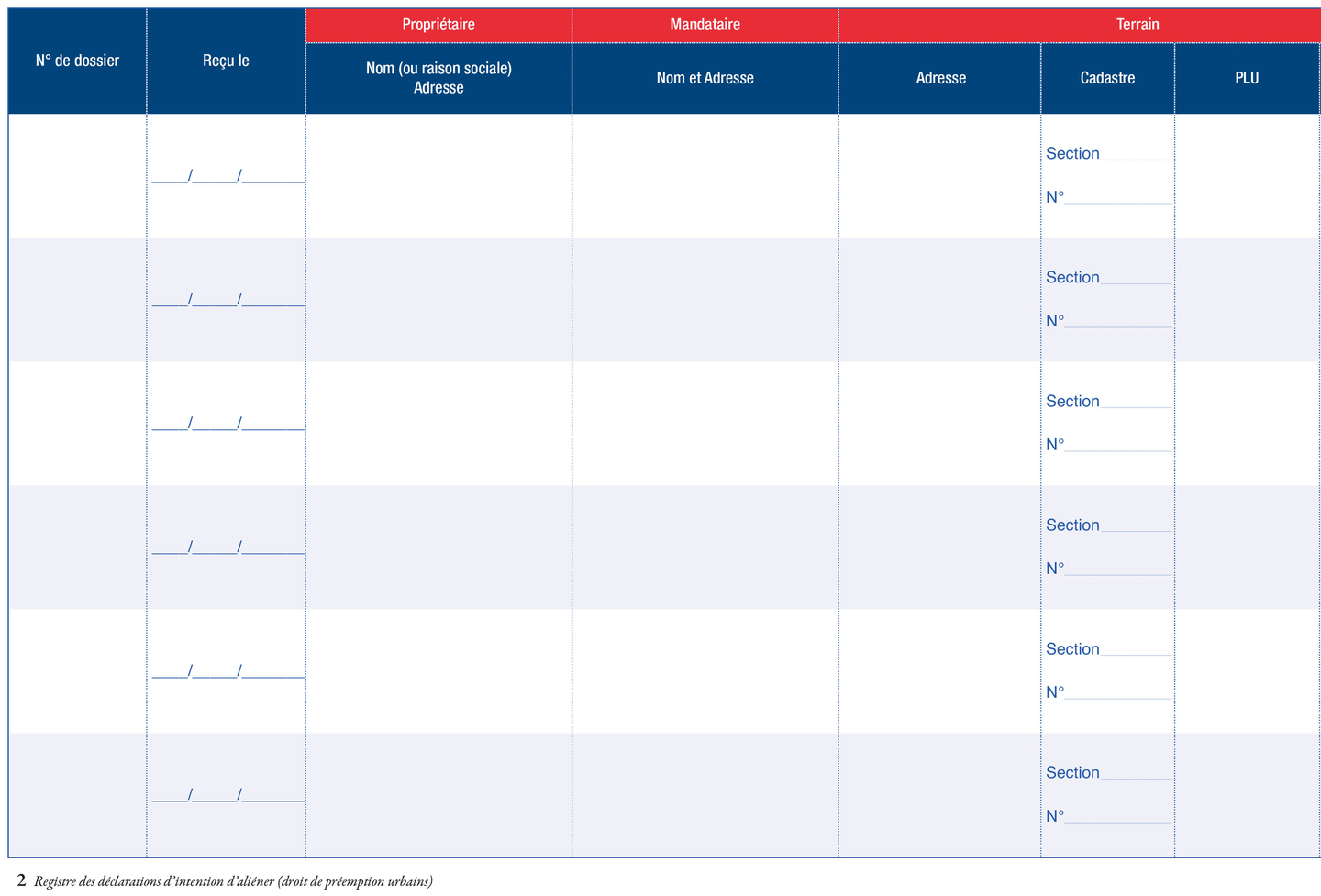 Registre des déclarations d’intention d’aliéner – droits de préemption urbains. Format 32 x 24 cm, 52 pages + 4 de couverture, reliure tissu, papier ISO 9706. Fabriqué en France.