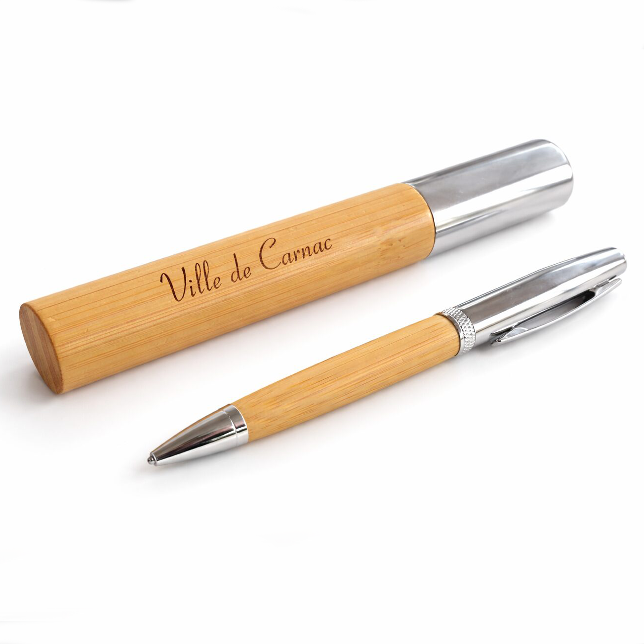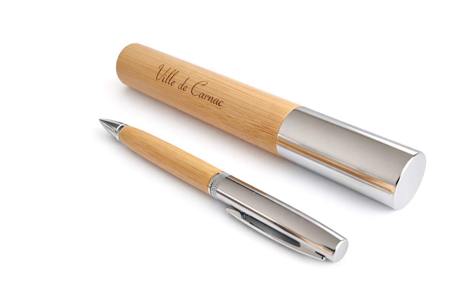 Stylo-bille en bambou avec attributs argentés, présenté dans un écrin cylindrique 149 x 25 mm. Élégant, naturel et pratique.